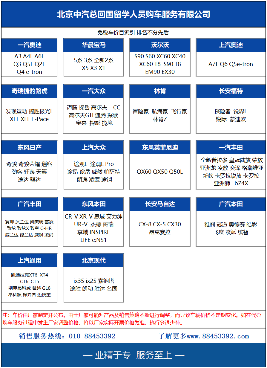 留学生回国买车/购车免税车价格表_中汽总留学生免税车