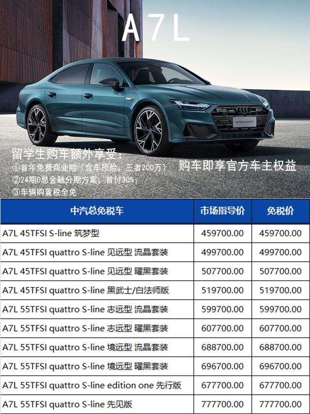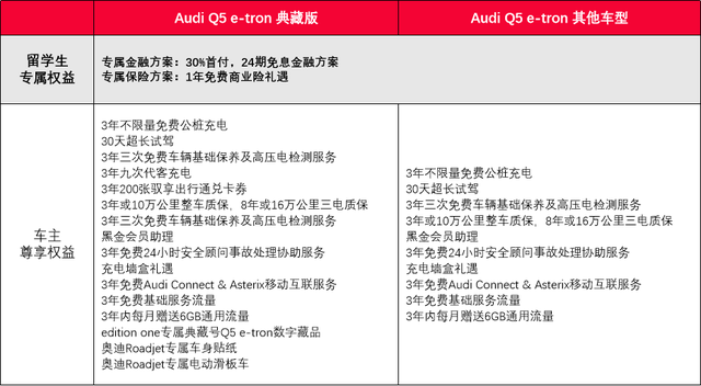 虽然奥迪Q5 e-tron和A7L两款新车在车价上没有优惠,但是厂家所赠送的各项权益还是很超值的。 购车即享官方车主权益 留学生购车额外享受: ①首年免费商业险(含车损险,三者200万); ②24期0息金融分期方案,首付30%; ③车辆购置税全免